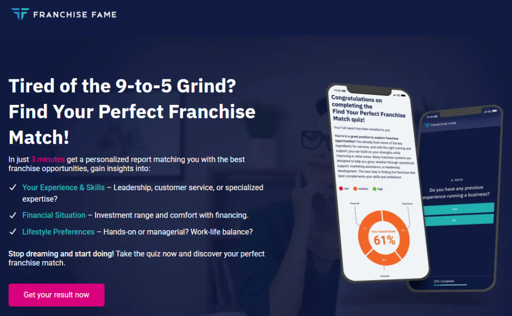 Finding the right business isn’t and shouldn’t be a guessing game. It needs to be a careful calculation. The Franchise Fame Perfect Franchise Match Quiz uses three critical pillars to determine if a specific opportunity is a match for your goals, your lifestyle, and your bank account.