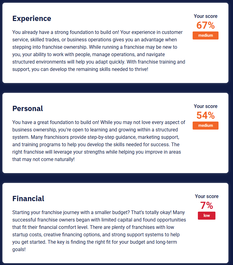 On completion, you won’t just get a “thank you” page. You will receive a Franchise Match Scorecard that breaks down: